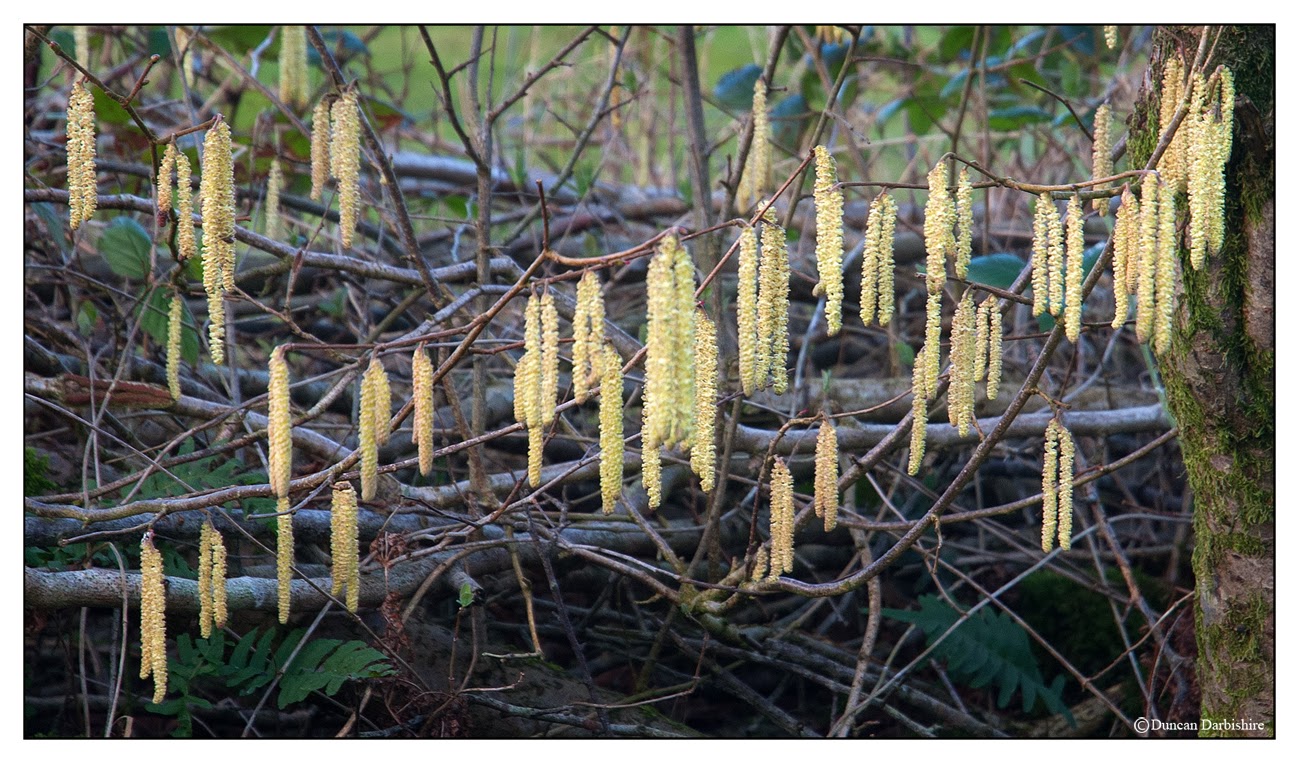 The pond is fed from both the stream and the ditch below the hedge where the hazel catkins are shedding pollen like dust on the breeze for the small red flowers to catch.
