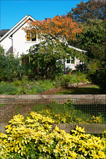 I might prattle on about successes but I have to admit to one failure, yet again. These are my flowerless sweet peas same as last year. It has got so bad I have already sown some for next year in deep pots and put them down in the Wendy House. Now all it needs is a lot of prayer and someone up there to take pity on me and tell the peas to get on with it. There is also colour in surprising places - the dying hosta leaves have a special beauty. (I should mention that the spell checker did not like costa and persisted in changing it to Costa! It is a sad world. In the pots by the back door - the one at the side - the violas are doing well. We changed to these small dainty flowers from winter pansies and these are much preferable. Notes made mentally for next year - violas everywhere?